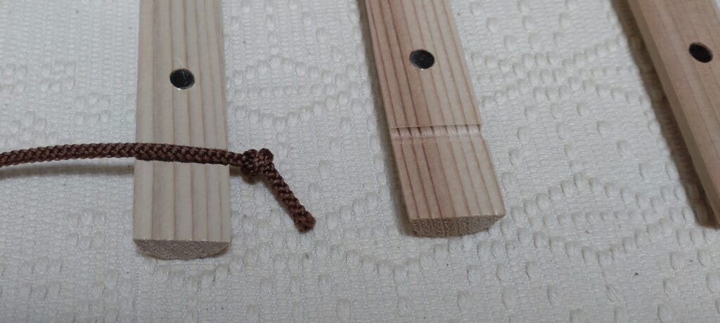 2.紐の両端を結び、棒の溝に挟む(こちらの棒が上になる)