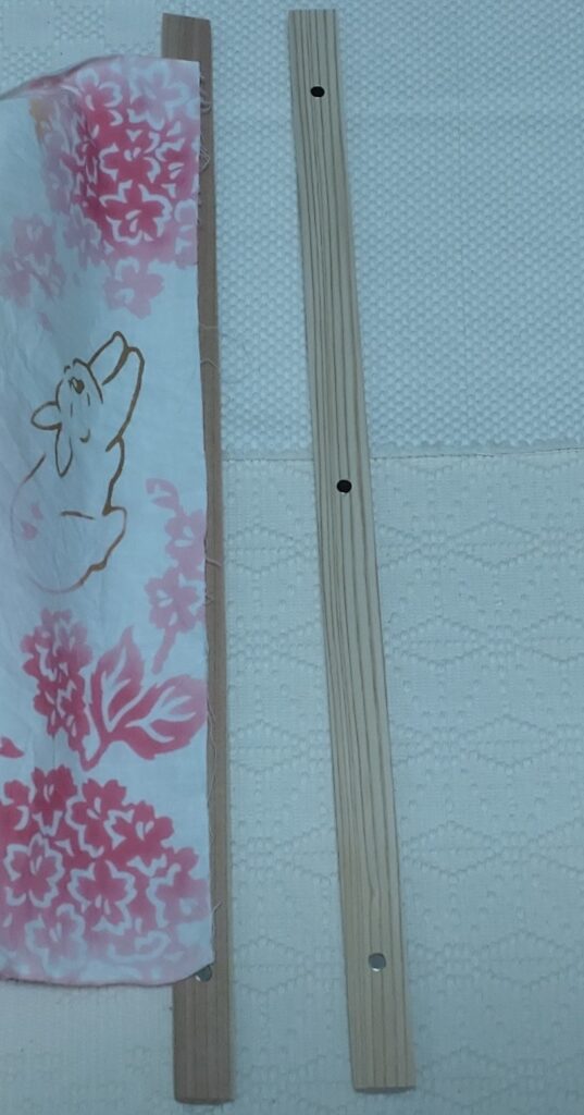 3.分割した棒で、手ぬぐいの端を挟み完成